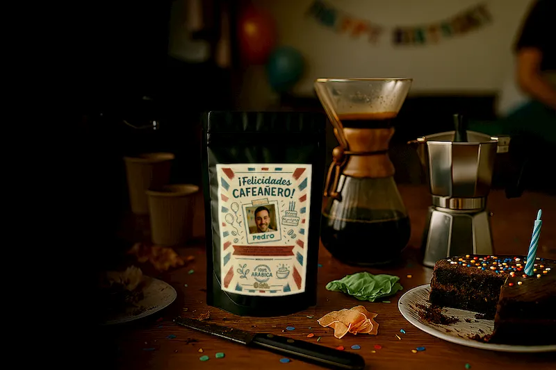 MyWay Cumpleaños es café de especialidad con etiqueta personalizable de temática fiesta. Elige variedad y tamaño, añade nombre, foto y una dedicatoria. Un detalle útil, cercano… y con sabor a celebración.